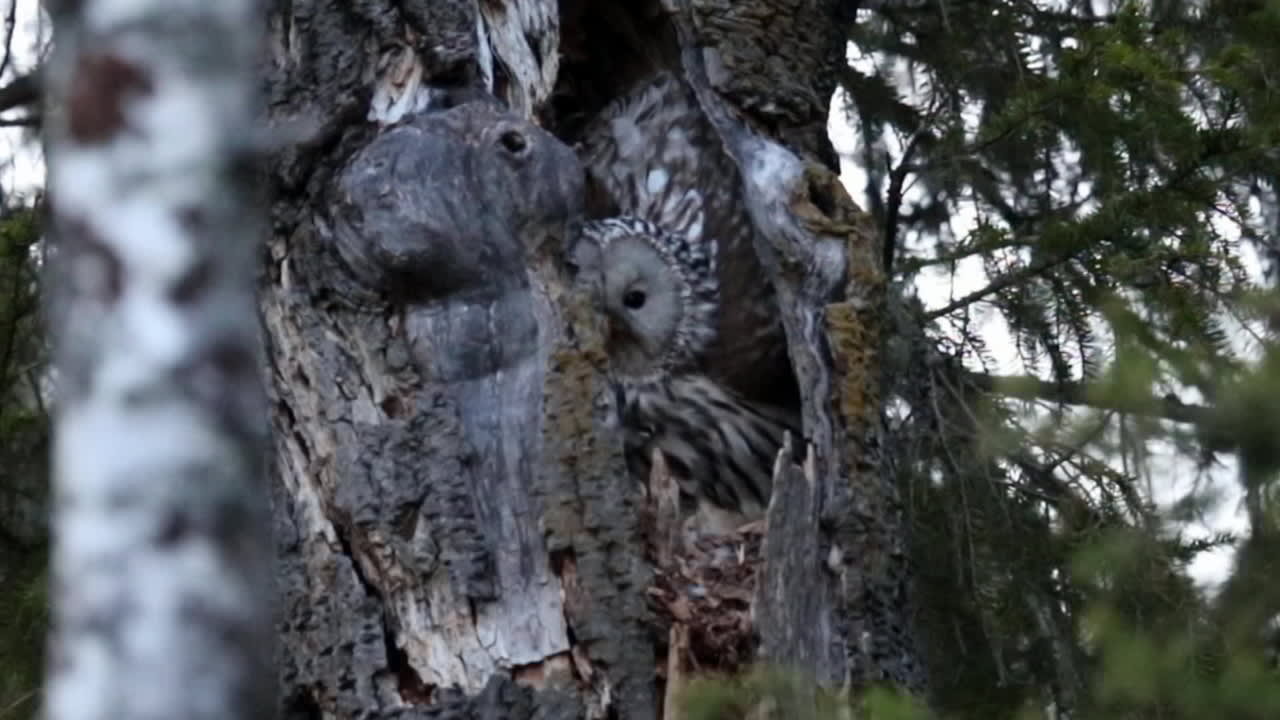Viirupöllöpari hoitaa poikasia Kuva: Mikko Lantto Viiruspöllöuros tuo myyrän pesälle jossa naaras pilkkoo sen poikasille. Uros katselee läheisestä puusta pesäpuun elämää..23 s Käynnistä ohjelma